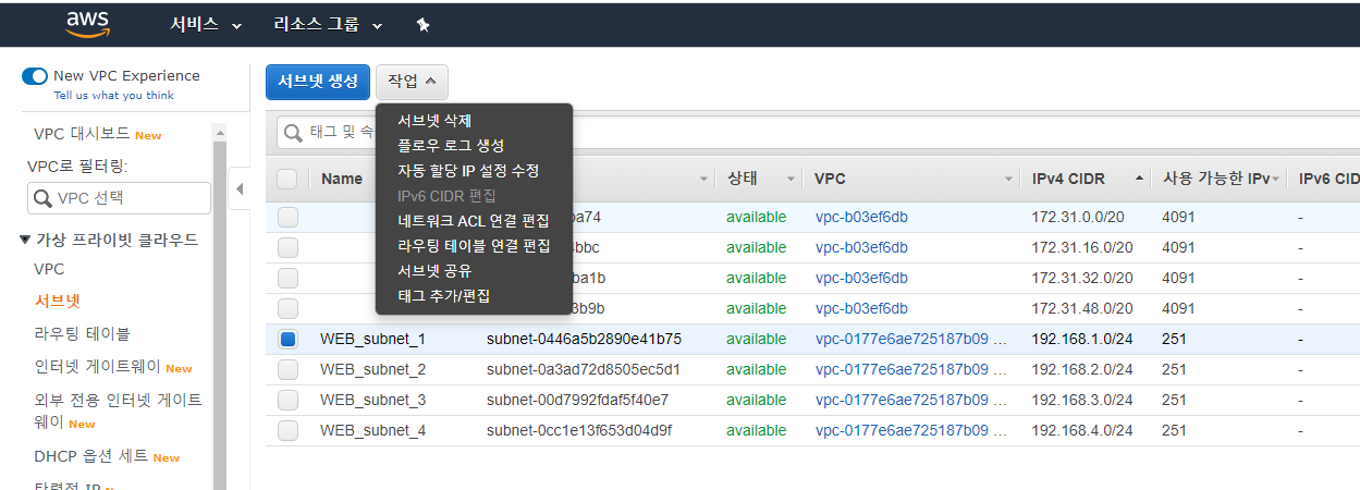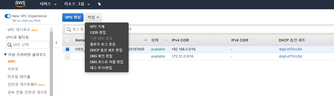 방금 만든 VPC(WEB_SERVER)를 선택 후 작업을 클릭한다.