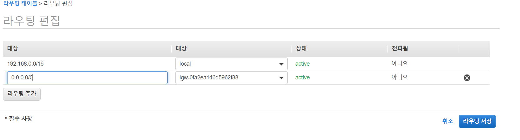 위와 같은 화면을 볼 수 있는데 라우팅 추가를 누르고 0.0.0.0을 입력하고 IGW를 선택해준 뒤 라우팅 저장 버튼을 눌러준다.