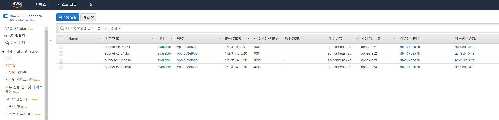 | 이름 태그 | VPC | 가용 영역 | IPv4 CIDR 블록 |