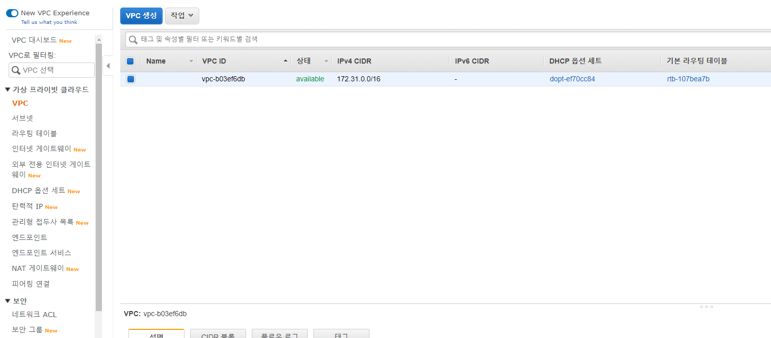 위에서 설명했듯이 172.31.0.0/16의 Default VPC를 볼 수 있다.