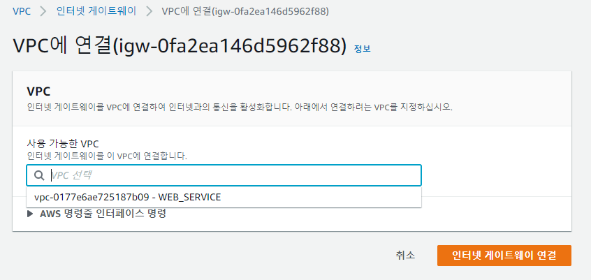 위에서 만든 VPC인 WEB_SERVICE를 선택하고 오른쪽 하단 인터넷 게이트웨이 연결을 클릭한다.