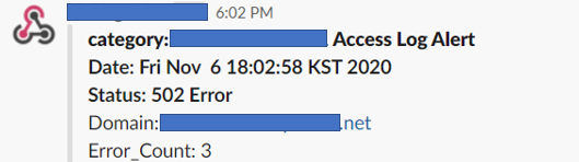 위 스크립트의 목적은 로그상 도메인에 해당하는 HTTP Status Code가 502인 것들을 1분 주기로 체크 하여 슬랙으로 알람을 전송하기 위함이다.