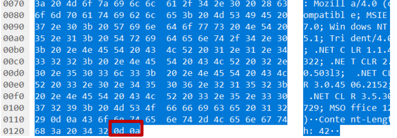 서버에 정상적으로 연결을 맺은 후 정상 HTTP Header는 위 그림과 같이 Header의 끝이 0d 0a 0d 0a를 통해 Header가 끝났음을 알리게 된다.
