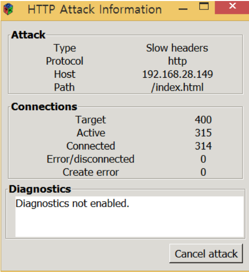 메인 화면에서 공격을 설정하여 Run Attack 버튼을 클릭하게 되면 위 그림과 같이 공격이 실행된다. 공격은 Window10(192.168.28.144)을 통해 공격하였고, 대상 서버는 Ubuntu(192.168.28.149)이다.