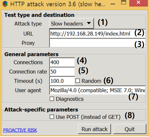 HttpDosTool3.6을 실행하게 되면 그림 초기 화면이 [그림1]과 같이 보인다. 화면의 구성요소는 크게 8가지로 나눌 수 있다.